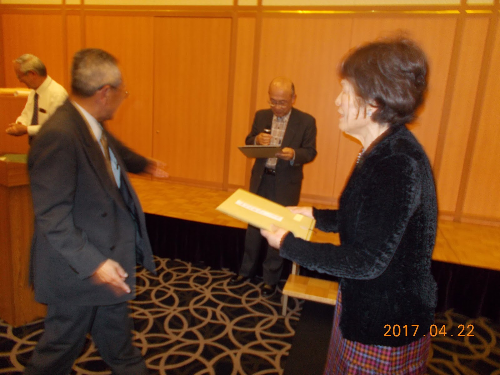 講演後、懇親会までの間に記念誌の発表と水墨画の入札、記念撮影をしましたが、その